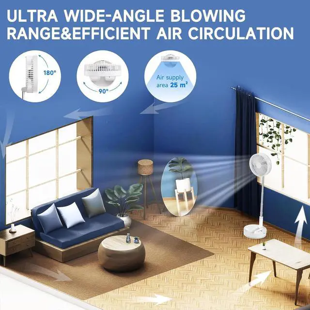 Adjustable Angle & Easy to Clean Home FanOur foldable home fan can be adjusted in multiple angles, can Auto-Vertical rotation 180°and Horizontal 90, keeping you cool from any angle. Besides, our foldable floor fan can be easy to disassemble to clean the front grille and fan blade. It not only ensures that you can keep your powerful fan clean without much hassle. but also great for prolonging the lifespan.