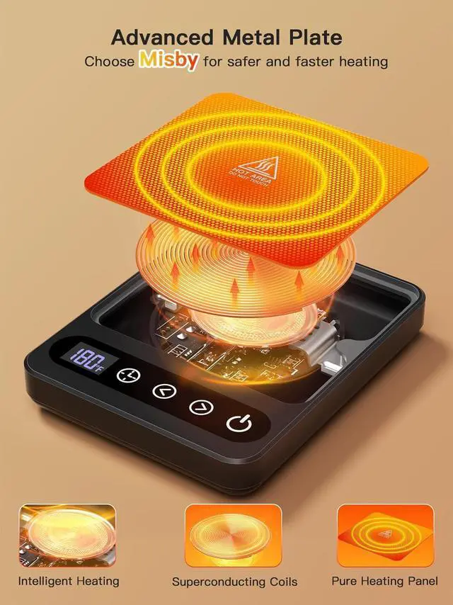 Great 6 Temperature DesignMisby coffee mug warmer features six precise temperature settings ranging from 120°F to 180°F, allowing you to customize the heat of your favorite beverages. Whether it's coffee, tea or milk, this mug warmer ensures your drink stays at the perfect temperature. The digital panel is easily read and adjusted, and the heater heats up almost instantly. Note: 180 is very hot, so unplug when kids are nearby