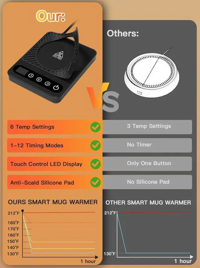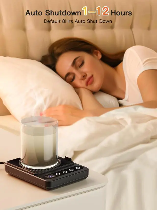 1-12 Hours Timed Auto ShutdownNever worry about forgetting to turn off your mug warmer. The auto-off timer allows you to set a shutdown time between 1 and 12 hours, with a default safety cut of 8 hours. This feature ensures energy efficiency and safety, making it a perfect addition to your desk or kitchen