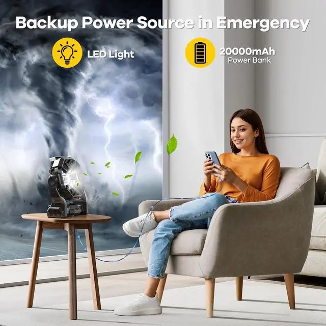 2 in 1 Rechargeable Camping FanThis battery operated fan has a built-in 20000mAh rechargeable battery with USB-A and TYPE-C ports. This battery operated fan can work continuously for 8-36 hours under the strongest wind speed. Also this battery fan can be used as an emergency power source for cell phones, flashlights and other accessories.