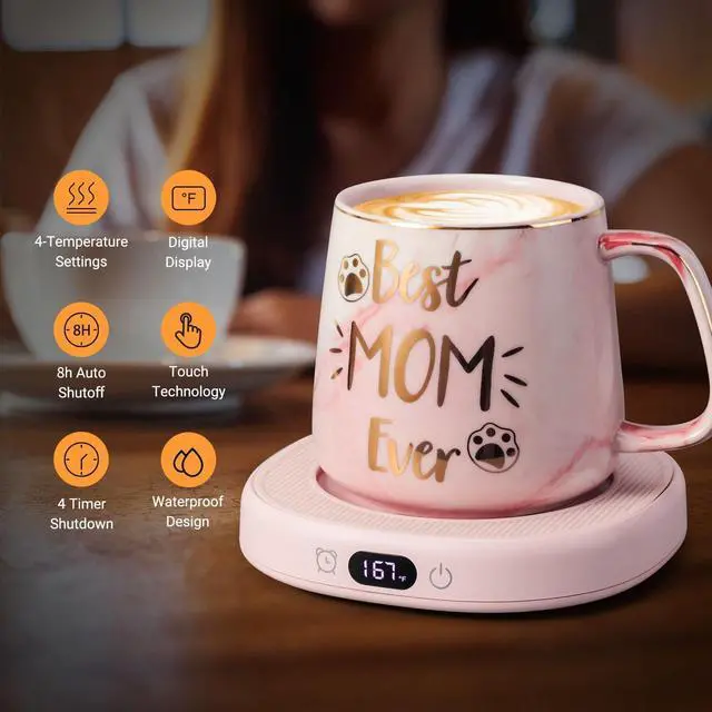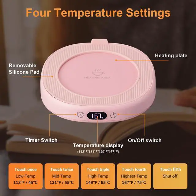 Adjustable 4-Temperature Setting: Coffee warmer will keep your coffee at a perfect drinking temperature. You can control the temperature by tapping the button, keeping your coffee, tea or milk up to 113 /131 /149 /167