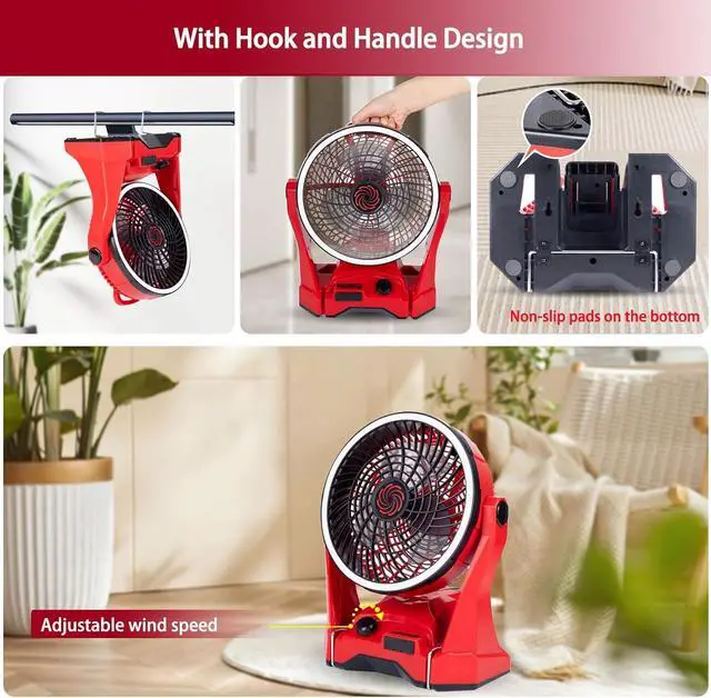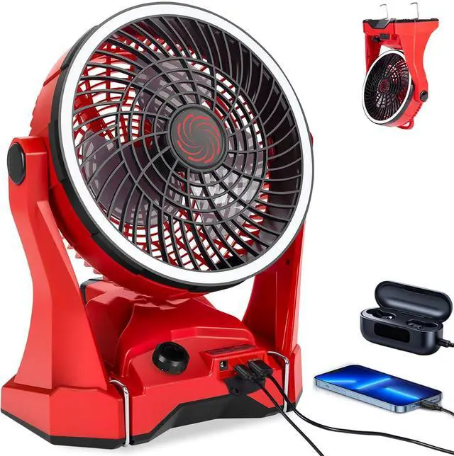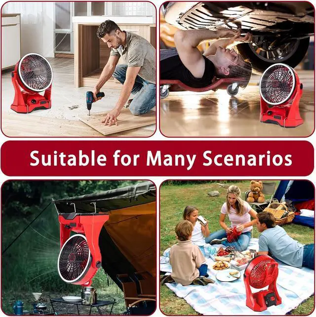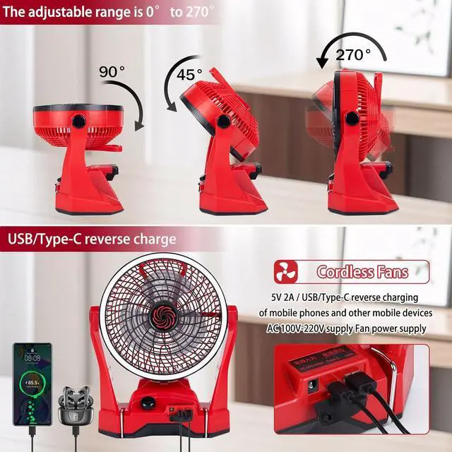 10inch Portable Cordless Fan Compatible with Makita 18V BatteryCordless design battery powered fan is easy to carry and place anywhere, indoor and outdoor. Equipped with both USB and Type-C ports, it supports 5V 2A fast reverse charging for mobile devices such as smartphones and tablets in case of emergency. It can not only be used in living rooms and bedrooms, but also be used in factories and warehouses and other places to help workplace ventilation.
