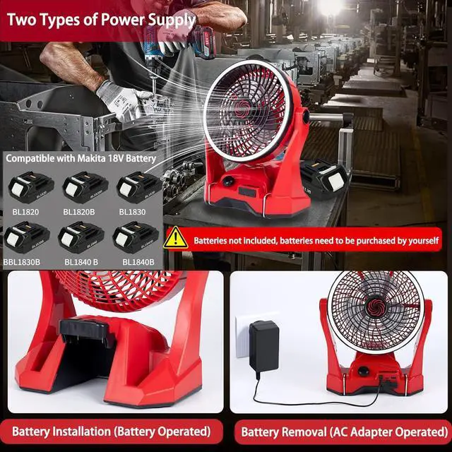 Cordless Battery Powered or Corded AC Power Powered1: Battery operated fan Compatible with Makita 18V batteries BL1830B BL1840B BL1850B BL1860B etc. *NOTE: (Battery and charger not included) When the fan is not used for a long time, please disconnect the battery from the fan to prevent the battery from over-discharging. 2: Use the included AC adapter to connect the jobsite fan to an AC power source. Two power supply options to meet all your needs.