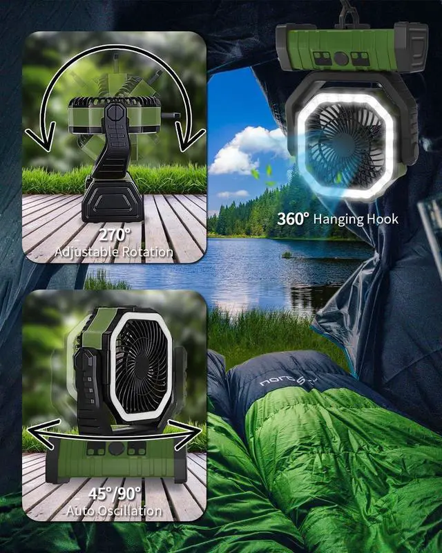 20000mAh Battery with Power Bank Function - ADUST 3 in 1 Rechargeable battery powered fan, equipping with a light, power bank and fan, has 20000mAh large capacity battery with high conversion rate. 100% power can be used continuously for 12-138 hours depending on different options. The portable camping fan have 5V/3A Type-C input/output and 5V/3A USB output charging port. Therefore you can use the battery operated fan as a large portable charger to reverse charging 2 phones for emergency using.