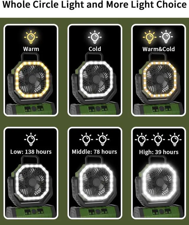 3 Level of Light Brightness & 3 Color Temperature - This camping tent fan with LED latern can illuminate your enviroment when it's dark. 3 color temperature, warm/cold/warm&cold, provide more options to meet your preference. Choose from low brightness to high brightness, a fully charged battery fan can be used for 138-78-39 hours.
