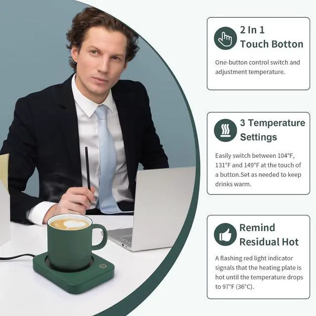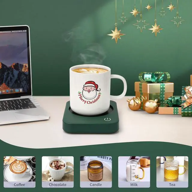 3 Temperature Settings 20 watt mug warmer for coffee, tea, milk, hot cocoa or your candle wax. You can warm or keep your coffee up to 104-131-149 (40-55-65). Just need to soft touch the button. Note: It does not support to boil liquids.