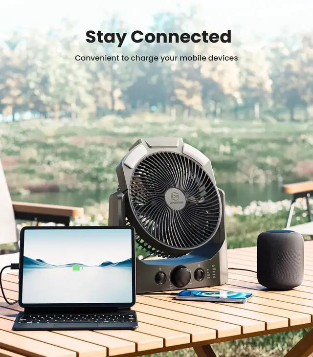 20,000 mAh Rechargeable Camping Fan: LEMOISTAR 8 inch battery operated fan built-in in 20,000 mAh large-capacity rechargeable battery, can work continuously for 10-52 hours after fully charged in about 8 hours; Rechargeable fan can charge your cell phone as well, it is perfect for camping and outdoor activities