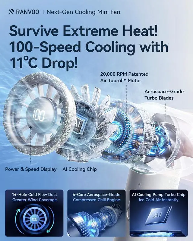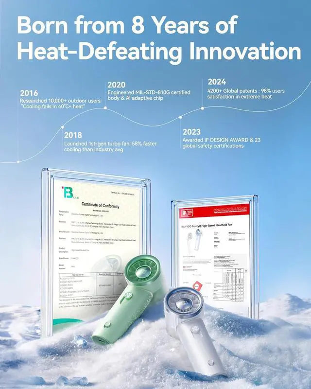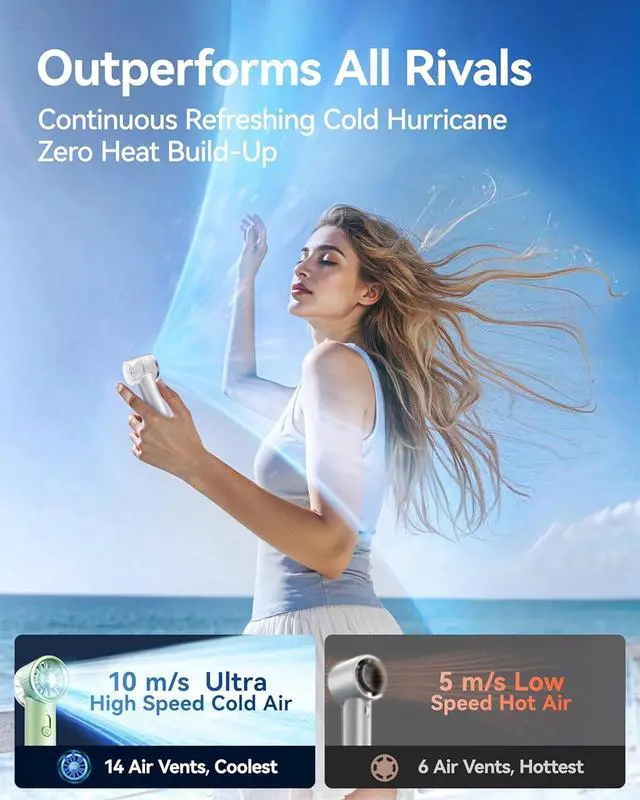 Heat-Slaying Revolution - 1s Cool Down: Driven by a German-engineered hyper-turbo motor (20,000 RPM), the mini handheld fan unleashes a hurricane-grade 10m/s icy jetstream, obliterating sweat and discomfort instantly. Combined with a 180° wide-angle airflow design, it wraps you in a full-body cooling shield, turning scorching commutes, sticky travels into your personal oasis !