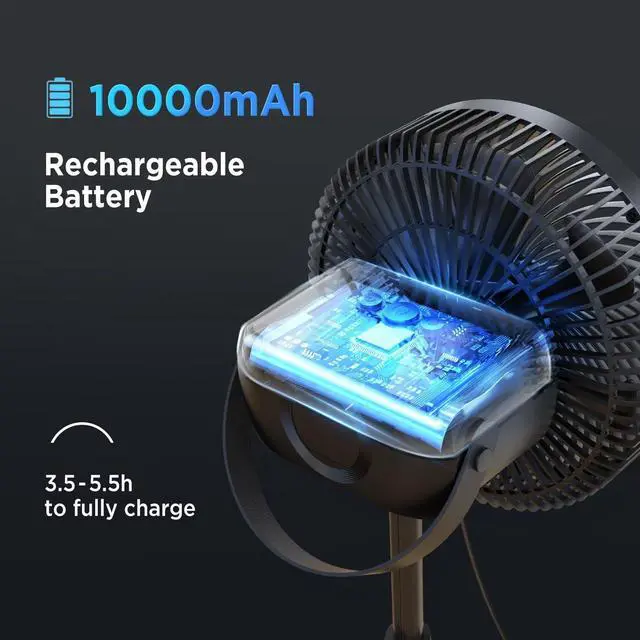 10000mAh recharger battery Long working Time Not afraid of power outages! The vertical fan is equipped with a 10000mAh rechargeable battery, which can work up to 30 hours, fully meeting the needs of outdoor activities. The Marchpower oscillating fan will be fully charged within 5 hours and can be used while charging. The battery design is convenient for outdoor use, without sockets, and the DC plug design is convenient for indoor use, energy-saving and efficient.