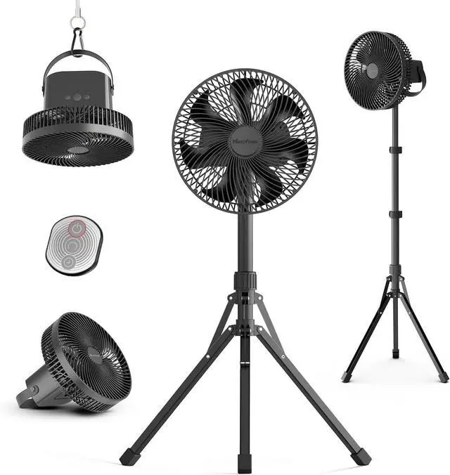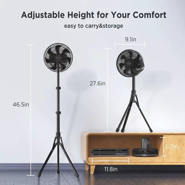 Detachable Tripod & Adjustable HeightAdopts stable tripod structure, you can freely adjust the height(Min27.6IN, Max46.5IN), detach it to use as a portable desk fan Or hanging the Tent Fan with carabiner from a suitable location creates an overhead breeze. It is convenient for both indoor and outdoor use, whether you are in bed, having lunch with your family, working on a laptop, or going camping outdoors.