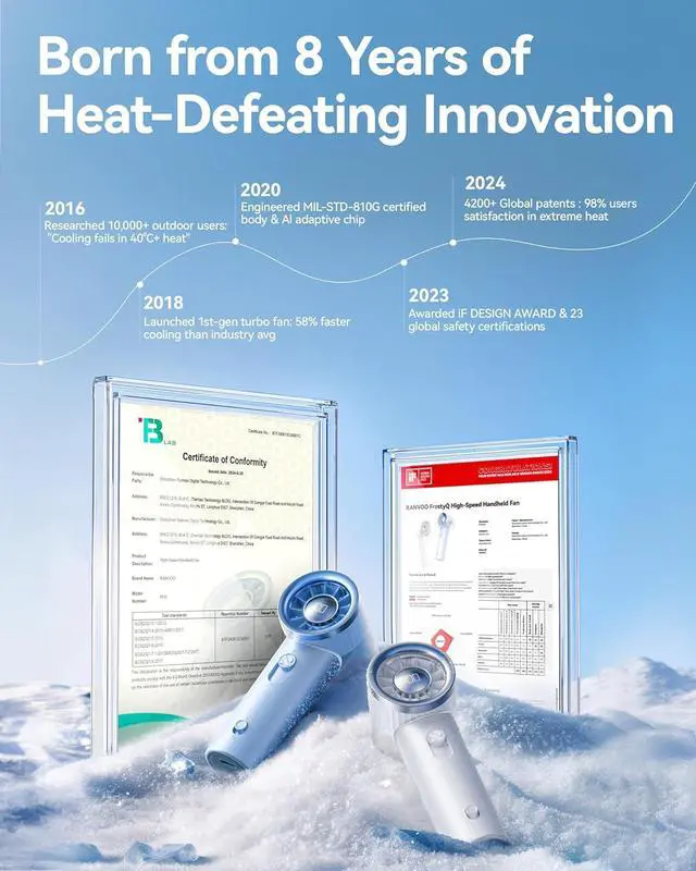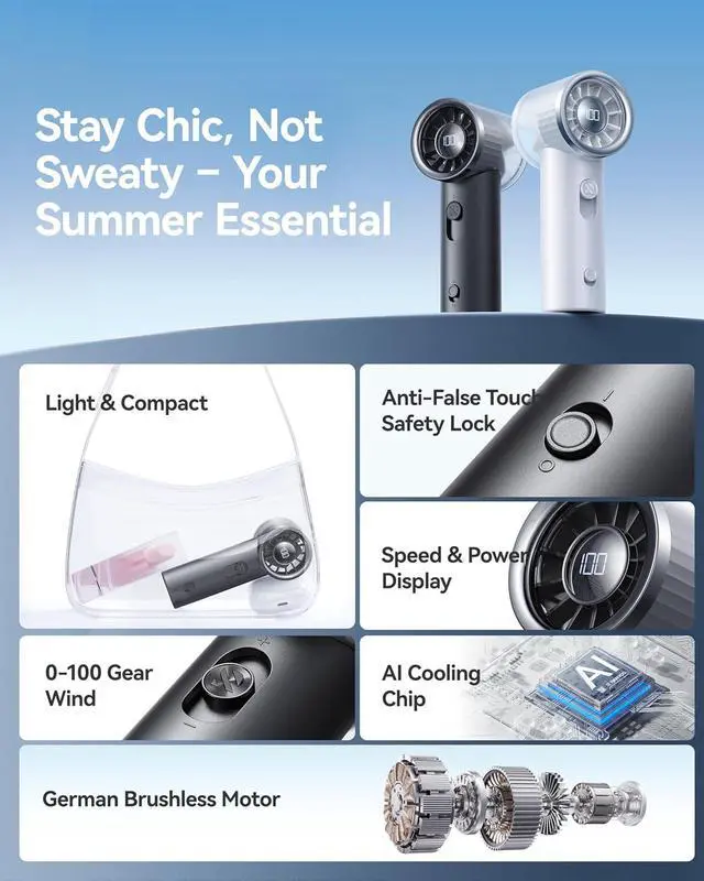 Heat-Slaying Revolution - 1s Cool Down: Driven by a German-engineered hyper-turbo motor (20,000 RPM), the mini handheld fan unleashes a hurricane-grade 10m/s icy jetstream, obliterating sweat and discomfort instantly. Combined with a 180° wide-angle airflow design, it wraps you in a full-body cooling shield, turning scorching commutes, sticky travels into your personal oasis !