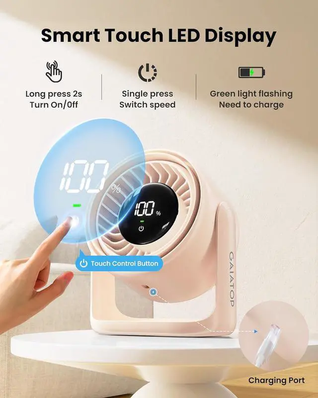 Intuitive Touch-Sensitive LED Display: Control your quiet desk fan with a simple touch. Turn the USB rechargeable table top fan on/off with a 2-second hold, and toggle seamlessly between 5 precise speed settings with a simple tap. The smart LED display clearly shows battery life before elegantly returning to gear infocombining elegance and functionality in your personal desktop fan