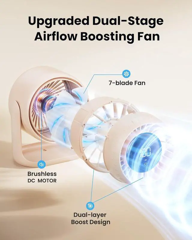 Advanced Dual-Stage Turbo Cooling Desk Fan: Experience powerful and refined airflow with our innovative dual-stage system, delivering a brisk max speed of 5.2 m/s. Seven strategically curved blades work in harmony to amplify wind pressure and ensure smooth, even circulationkeeping you comfortably cool all day