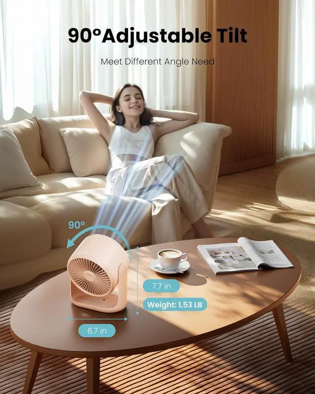 90° Adjustable & Space-Saving Desktop Fan: Direct airflow exactly where needed with full vertical tilt. Compact yet powerful, this small desk fan fits neatly on desks, nightstands, or shelves. A versatile tilting fan ideal for office, dorm, bedroom, or travel use