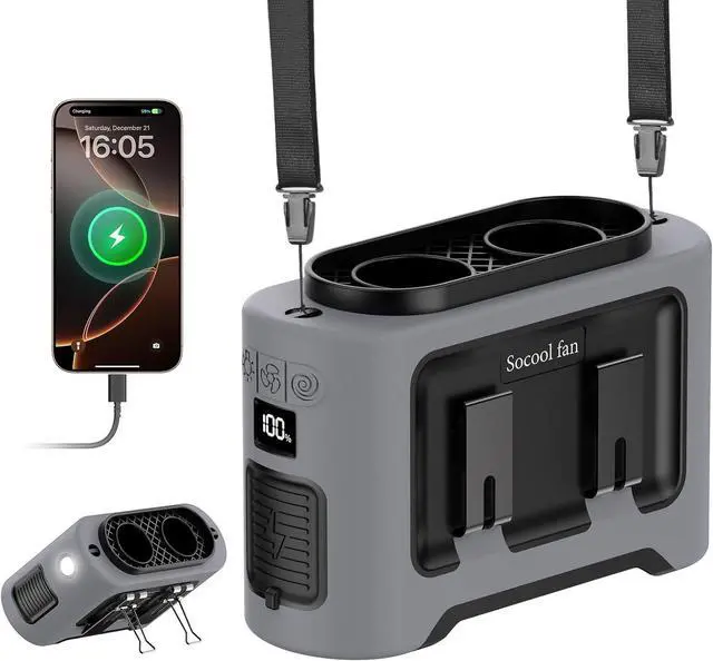 5-in-1 Multifunctional Waist Clip FanThe portable waist fan functions as a waist clip fan, neck fan, desk fan, and handheld fan. Clipped it onto your clothes, shirts, and pants, hang it around your neck, or prop it up on a table with the kickstand, keeping your hands free. Designed with a bottom air intake, the portable belt clip fan deliveries a strong and unobstructed airflow