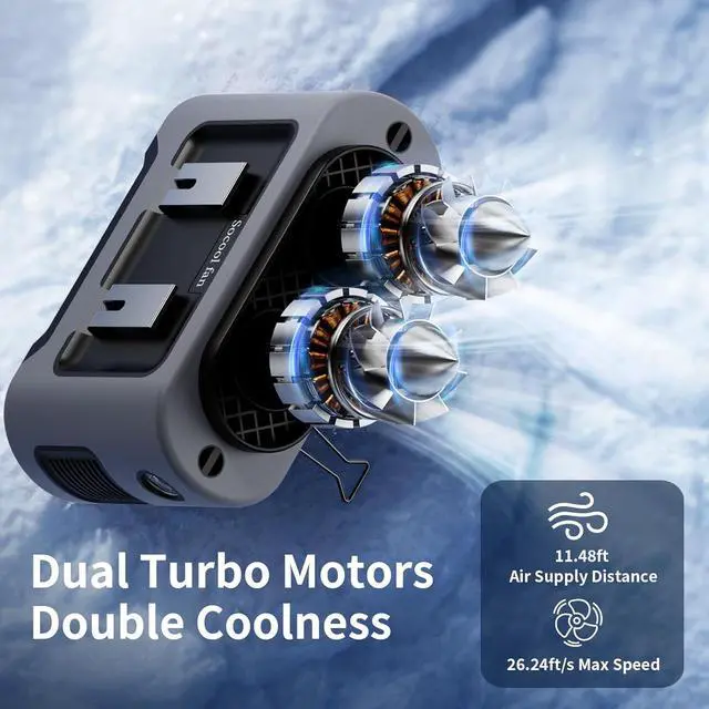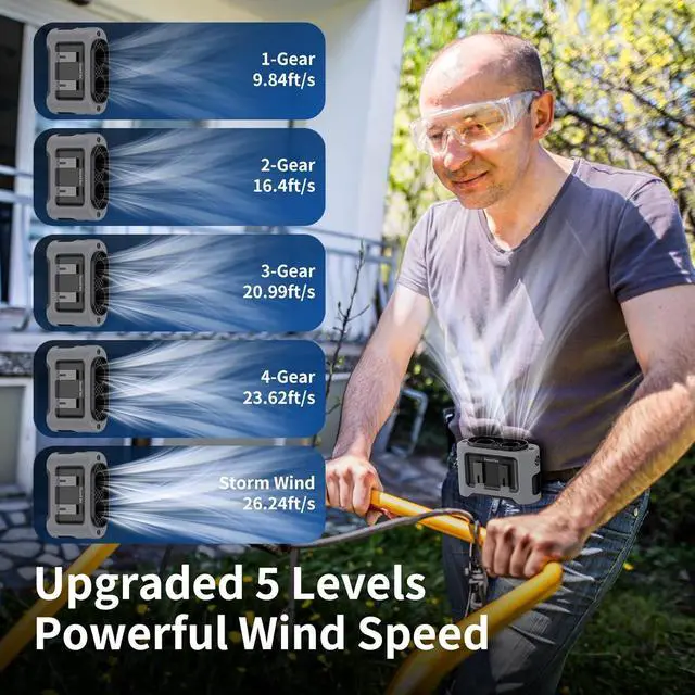 5 Levels Power Wind & Dual MotorsEquipped with dual hight-speed turbo motors, the personal waist fan can reach a maximum speed of 14600 RPM, generating airflow up to 26.24 ft/s and an air supply distance of 11.48 ft. With five adjustable speed settings, from natural to gust, its perfect for construction workers who need powerful cooling in high temperatures