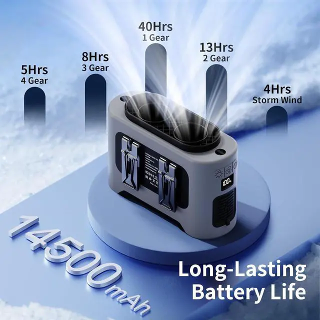 Long Lasting Working TimeThe waist rechargeable fan runs for up to 40 hours on low speed and takes 6.5 hours to fully charge. It lasts 4 hours on maximum wind speed and supports charging while in use, keeping you cool all day (No Standalone lithium batteries are sold with the product)