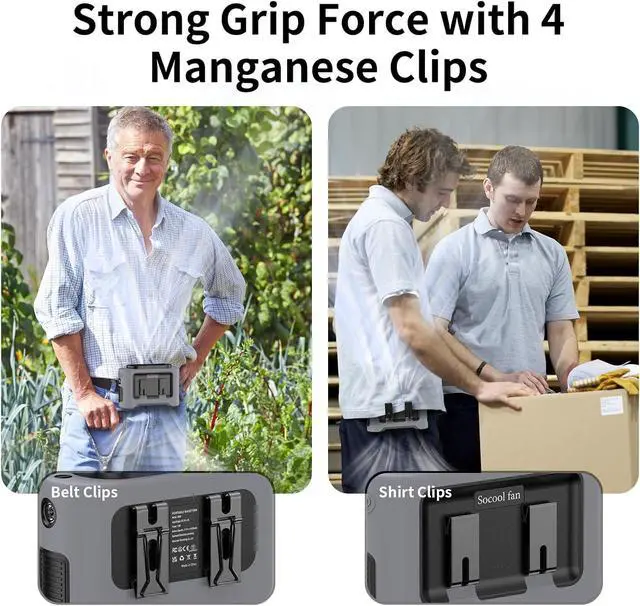 Belt Fan with 4 Manganese Clips & Silicone CoverThe Portable Cooling fan includes two belt clips and two shirt clips, providing enhanced grip strength. The practical design with four clips facing opposite directions allows for versatile placement options as well as a high-quality protective silicone outer cover design for protecting against shocks and drops