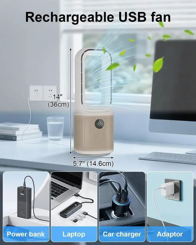 USB Powered & Rechargeable FanPortable rechargeable fan featuring a large-capacity battery that delivers 3-10 hours of runtime on a single charge (varies by speed). Equipped with Type-C USB fast charging, it powers up quickly for portable use anywhere. The 3-phase brushless motor ensures ultra-strong cooling performance with whisper-quiet operation, ideal for offices, bedrooms, or outdoor adventures. Customize airflow direction with its 60° wide-angle rotation, targeting hot spots precisely