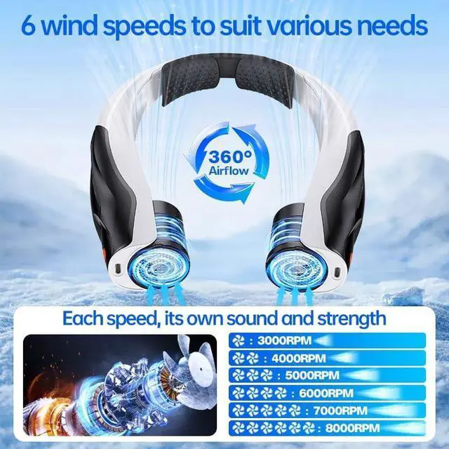 QUICKLY DOWN COOL: The wind speed of the neck fan is upgraded to 6 speeds adjustable to meet different needs. The wind speed ranges from 3000-8000rpm (Note: The higher the wind speed, the faster the blades and turbine rotate, which may also produce noise. It is recommended to adjust the wind speed to a comfortable level before use.). There are two small air guide plates at the fan barrel, which can blow strong and comfortable wind directly to your neck and face, allowing you to cool down quickly