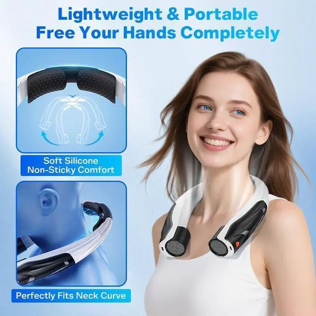 ALL DAY WEARING WITHOUT BURDEN: The neck support area is customized with a soft silicone cushion with a 15° elevation angle that naturally conforms to the natural curves of your head and neck for long periods of time without fatigue. Inside, a lightweight yet strong aluminum alloy skeleton provides stable and reliable support, ensuring that the rechargeable neck fan fits securely in any situation without slipping