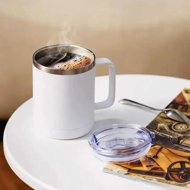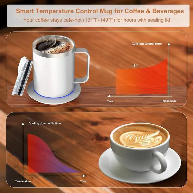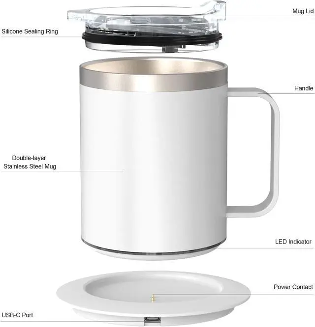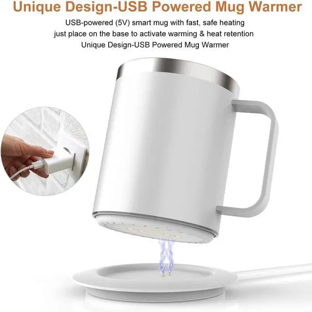 Self Heating Mug: Powered by 5V USB, this heated coffee cup features a built-in MCH ceramic heating element at its base, enabling faster heating. When placed on the mug warmer for desk , the heat preservation function will be activated to keep your drink at approximately 55/131(with lid on)