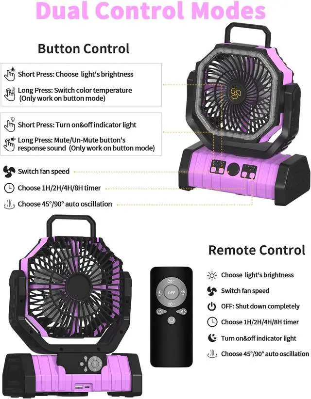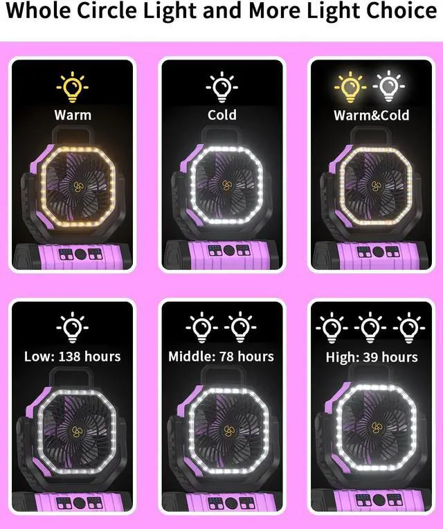 3 Level of Light Brightness & 3 Color Temperature - This camping tent fan with LED latern can illuminate your enviroment when it's dark. 3 color temperature, warm/cold/warm&cold, provide more options to meet your preference. Choose from low brightness to high brightness, a fully charged battery fan can be used for 138-78-39 hours.