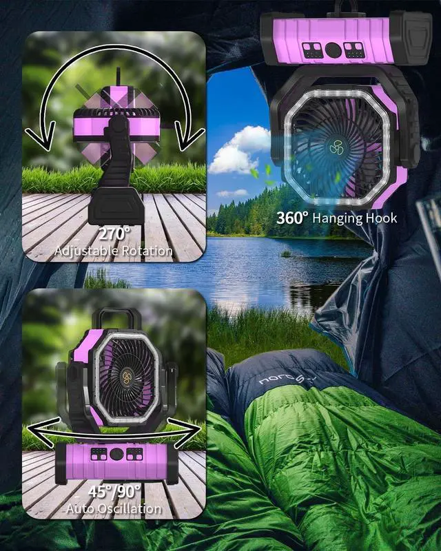 45°/90° Auto Oscillation & 270° Manual Pivoting & 360° Hanging Hook - Selectable 45°/90° oscillation provides you a comfortable and natural wind instead of straight wind(The angle can also be fixed). Our portable fan is designed with 270° manual upside down pivoting. 360° Hanging Hook design allows you to hang it anywhere and at any direction.
