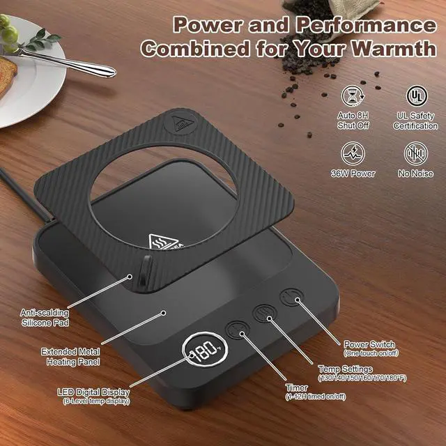 Customize Temperature/Timing SettingOur cup warmer with 6-Level Temp for your choice (130/140/150 /160/170/180) . Just a tap of your finger to change the temperature. Upgrade the delay timer setting from 1 to 12 hours, ensuring the best coffee taste is ready when you need it. Maintain The Perfect Temperature Of Drink, ensuring that you can savor the warmth and aroma of your beverages from the first sip to the last.
