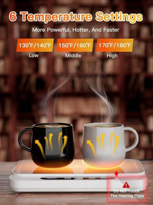 6 Adjustable Temperature SettingsThis coffee mug warmer offers six adjustable temperature settings, which easily range from 120 to 180 (with a default value of 120), making it perfect for your drinking preferences. Whether your taste leans toward a gentle, soothing heat or a steamed cup of coffee, our coffee warmer lets you take full control!