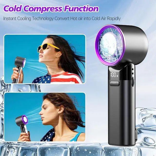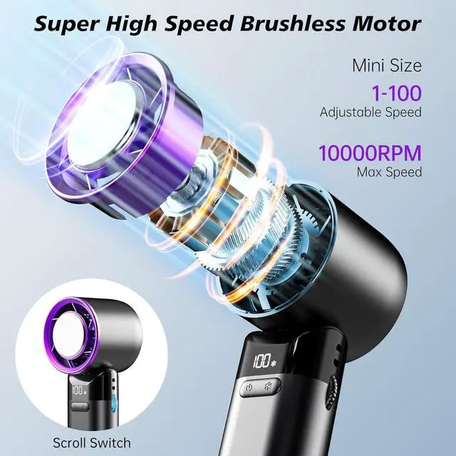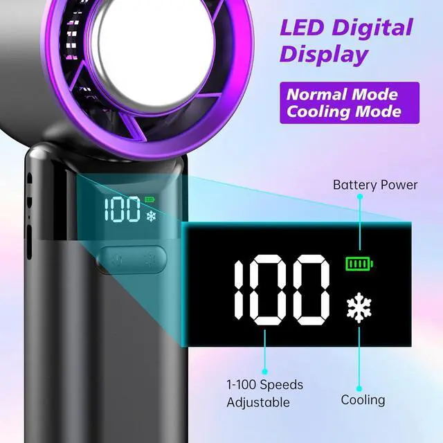 Super Power Handheld Fan: This mini portable fan features a high-speed 10,000RPM motor , delivering powerful airflow up to 6.2m/s for an exceptional cooling experience. With adjustable speed from 1-100 settings, it caters to diverse needs.(Please note!!! When the mini fan is in cooling mode, the maximum speed setting is 50; in normal mode, the maximum speed setting is 100.)