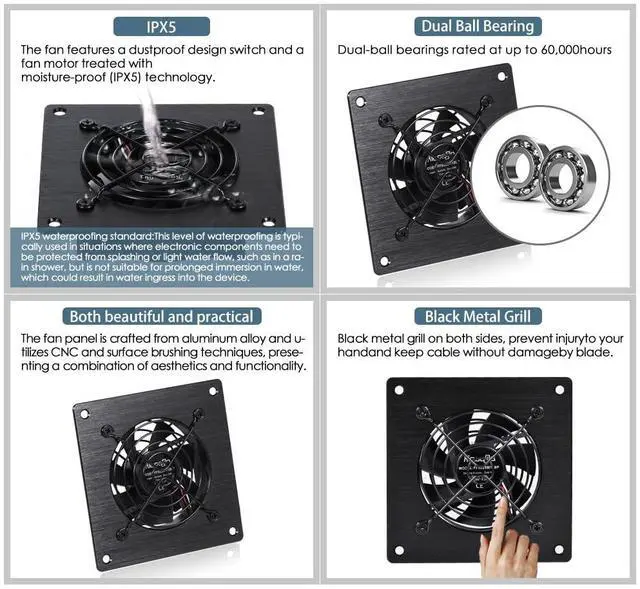 High Quality: We prioritize durability and performance. The fan features a dustproof design switch and a fan motor treated with moisture-proof (IPX5) technology. This ensures the fan can handle a variety of complex environments, providing reliable and efficient cooling. Equipped with double ball bearings, this fan has an impressive service life of up to 60,000 hours, guaranteeing long-lasting and consistent performance.