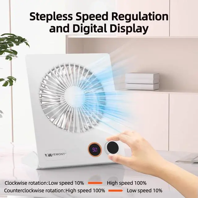 Stepless Speeds & Strong AirflowThe personal desk fan is controlled by one button to switch on/off,wind speed and timer.The stepless speed can offer 19 variable speeds,it allows you to adjust to any wind speed you are comfortable with. The powerful brushless motor can produce strong wind, and the maximum speed can reach up to 4000rpm and 4.65m/s. which can bring you coolness in the hot summer.