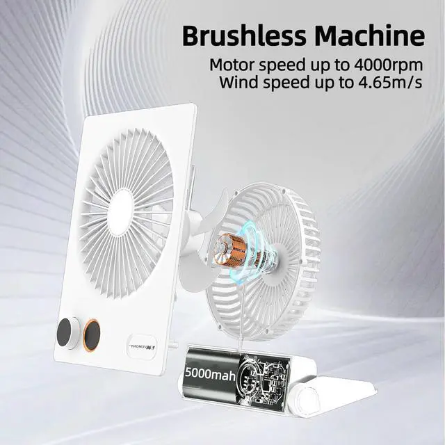 Rechargeable Battery & USB Powered FanThis rechargeable fan with built-in upgraded 5000mAh battery, long working time for 4-11hours,Best fan for outdoor activities such as camping and traveling. And it can also be plugged into a USB power for continuous use. Included USB data cable with 5V 2A output allows charging via computers, chargers, power banks, and more.