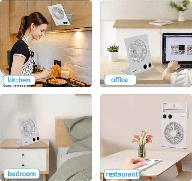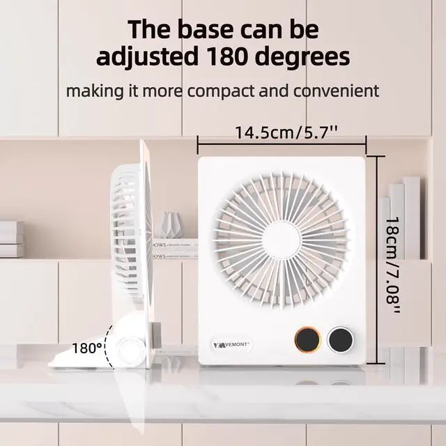 Compact Size & PortableThe size of the small table fan is: 14.5cm * 18cm/5.7inch * 7inch, and the thickness of the fan is only 4cm/1.57inch after it is folded flat. It is so slim that it can be put directly into your backpack or anywhere in your luggage. It can not only meet the needs of ordinary desk fans on the desktop for home and office use, but also meet any of your outdoor needs such as: camping and traveling.