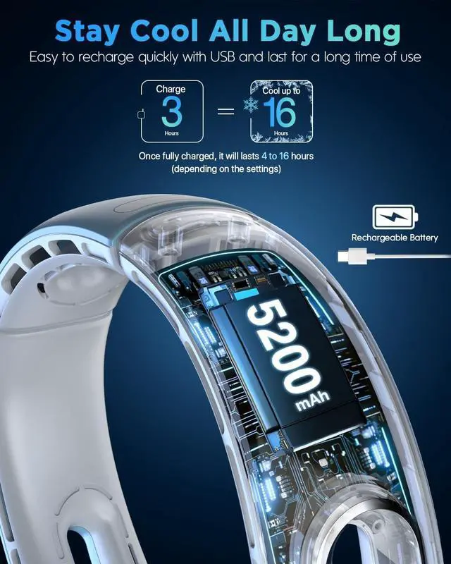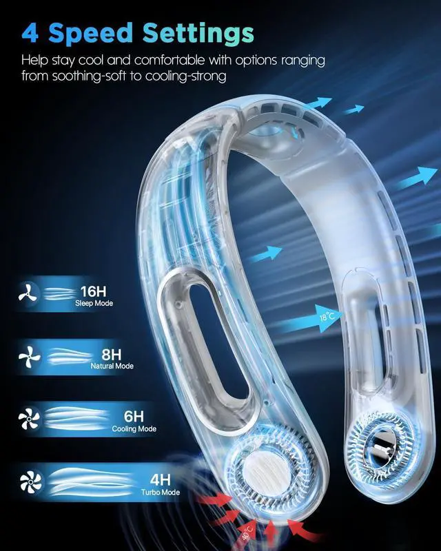 4-16 Running Hours & 4 Speed SettingsPresenting 4 modes (Sleep/Comfortable/Cooling/Turbo) and 4 speeds from soothing-soft to cooling-strong, you can easily adjust the airflow speed for your comfort by simply pressing the power button. With a built-in 5200mAh rechargeable battery, the neck fans portable rechargeable run for up to 16 hours continuously in sleep mode (at 40% volume) or 4 hours in turbo mode. A single charge lasts a long time and keeps you cool all day