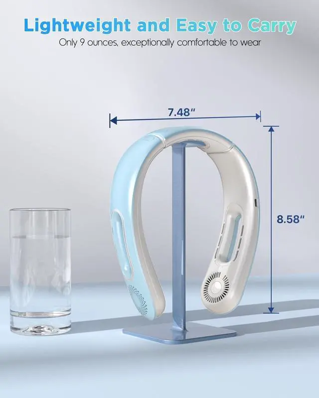 Designed for Comfort & SafetyThe bladeless neck fan air conditioner weighs only 9 oz and features a 3 large hole design on the device to put less strain on the neck, delivering unmatched comfort and a cool breeze. Made of skin-friendly ABS material, the hair pinch-proof design adds extra comfort and ensures the users safety for long-haired people, kids, and the elderly. The cooling neck fan is designed to provide hands-free operation, keeping you cool while engaging in various activities