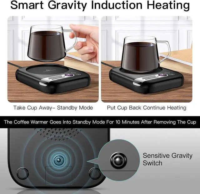 Auto On/Off with Gravity Sensor: This coffee mug warmer automatically turns on and off with a gravity sensor when you place or remove a cup. It shuts off for safety if the cup is removed for more than 10 minutes or if it doesn't detect a cup weighing at least 10.5 ounces (300 grams).