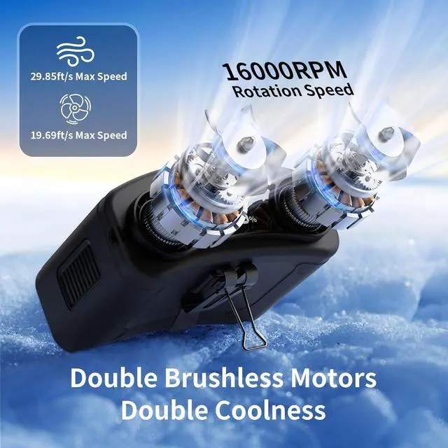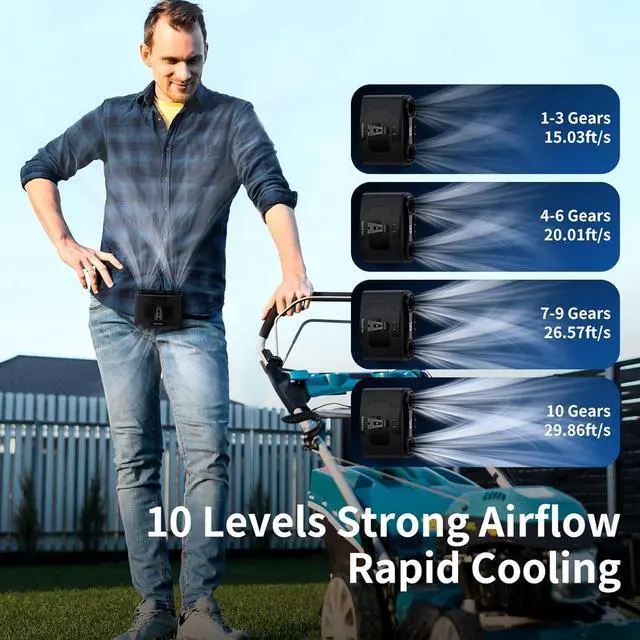 10 Levels Power Wind with Dual MotorsThe cooling fan features dual high-speed brushless motors with a max speed of 16000 RPM, airflow up to 29.85ft/s, and air supply distance up to 8.2ft. With 10-gear adjustable wind speeds ranging from natural to strong and double air outlets for double cooling, this waist fan is ideal for outdoor construction workers, farmers