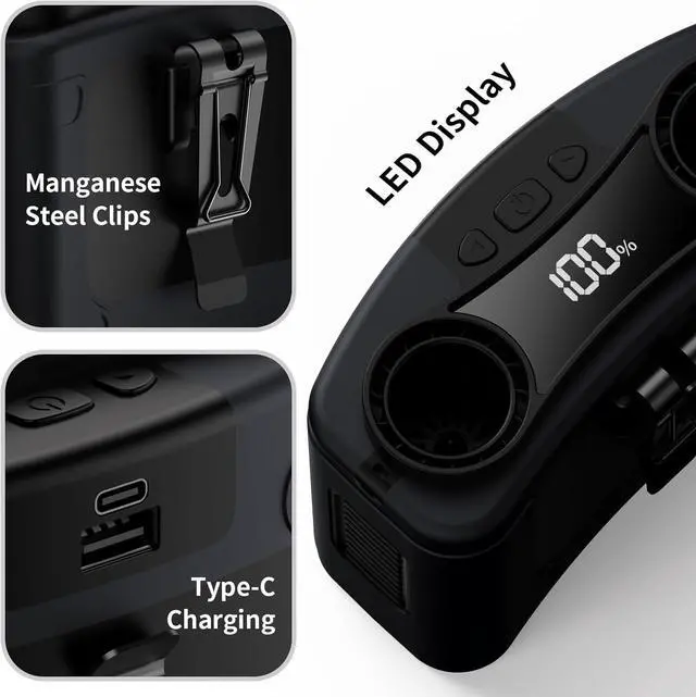 Emergency Power Supply with LED DisplayThis waist rechargeable fan features a 5V-3A Type-C input for fast charging from USB chargers, laptops, and car chargers and a 5V-3A USB output to charge your phone during power outages or extreme weather. With an LED display design, clearly shows wind speed and battery life, allowing for quick adjustments and timely charging