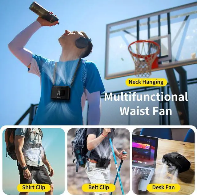 5-in-1 Multifunctional Waist Clip FanA Portable fan serves as a waist clip fan, neck fan, desk fan, and handheld fan. The Personal fan can be clipped onto clothes, shirts, and pants, worn around the neck, or propped up on a table for hands-free use