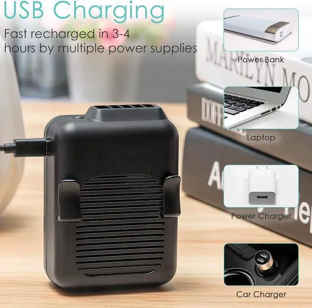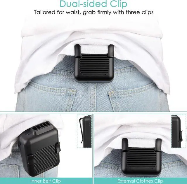 3-in-1 Waist Fan: This waist fan with compact size is specially designed with dual clips. The bigger one on the back for the belt and pants, while the smaller ones in front for fixing clothes corner. Plus, a necklace strap is included for better portability. You can clip the fan to waist, hang it around neck, or just hold it by hand to bring cool breeze everywhere