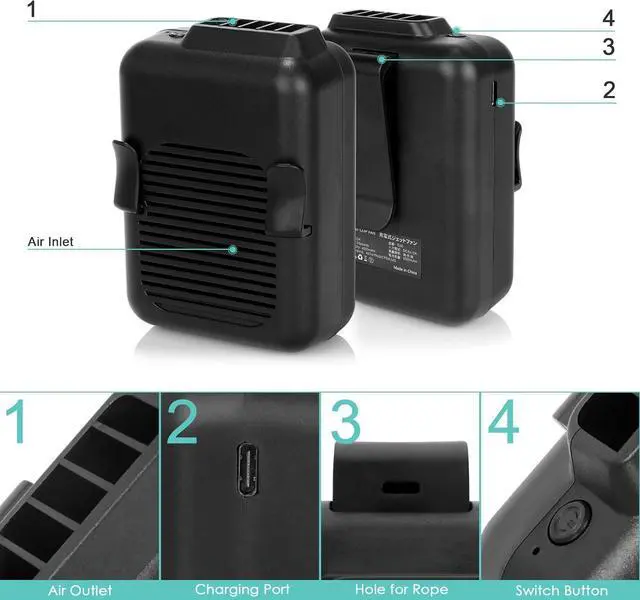 What You Get: (1) Portable Mini Waist Fan; (2)USB Cable; (3) Neck Strap; (4) User Manual