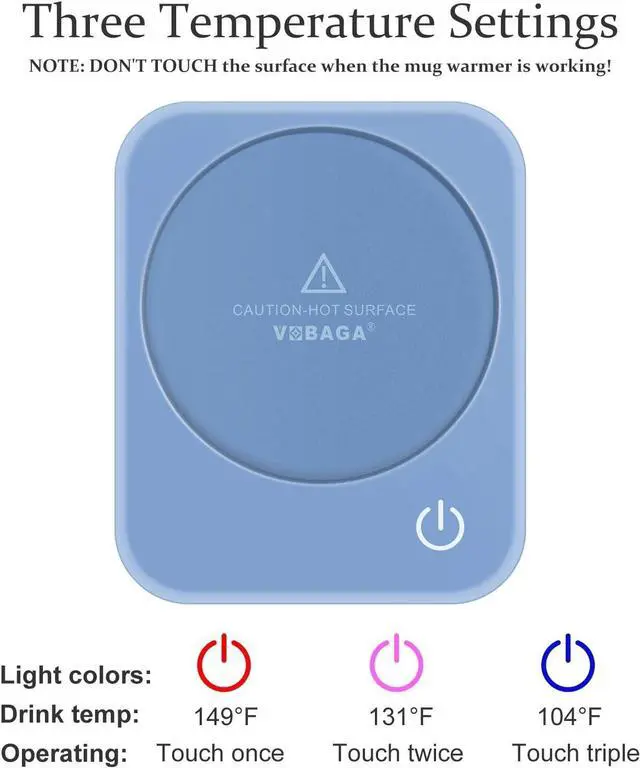 Adjustable Three-Temperature Setting: VOBAGA coffee warmer will keep your coffee at a perfect drinking temperature. You can control the temperature by tapping the button, keeping your coffee or milk up to 104-131-149 (40-55-65). Changing temperature is just a tap on of your finger.