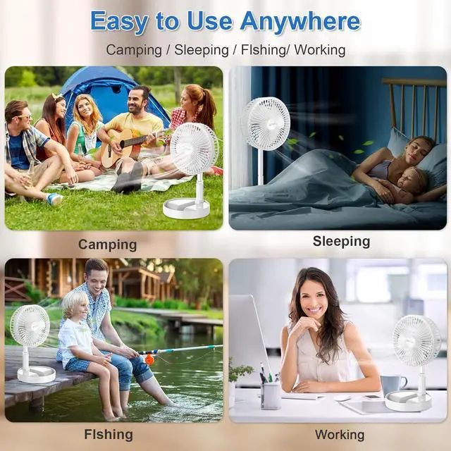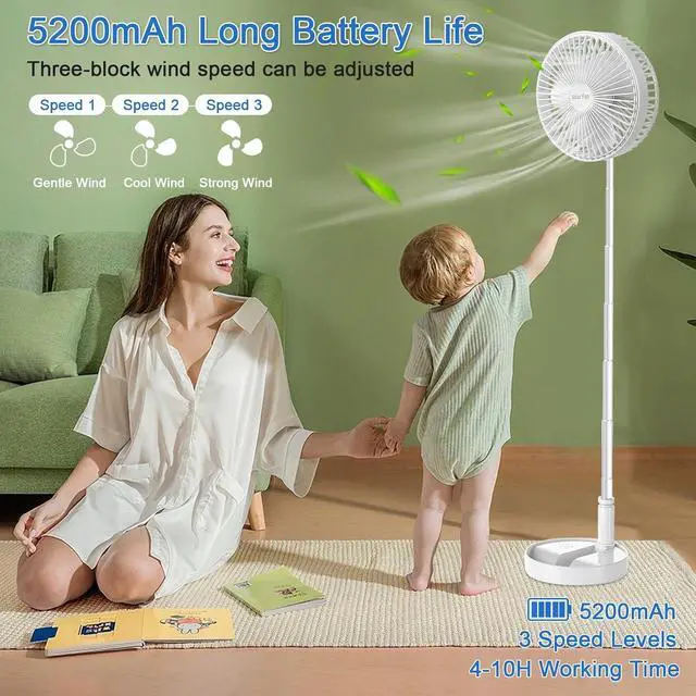 Super Quiet Fan with 3 SpeedsThis folding travel fan offers three levels of windbreeze wind, soft wind, and strong windto meet your various cooling needs. The rechargeable floor fan not only generates a strong airflow for quick cooling but also operates at a low noise level of 32~40db. It is perfect for use as a bedroom bedside fan, ensuring a peacefully cooling and quiet sleep.