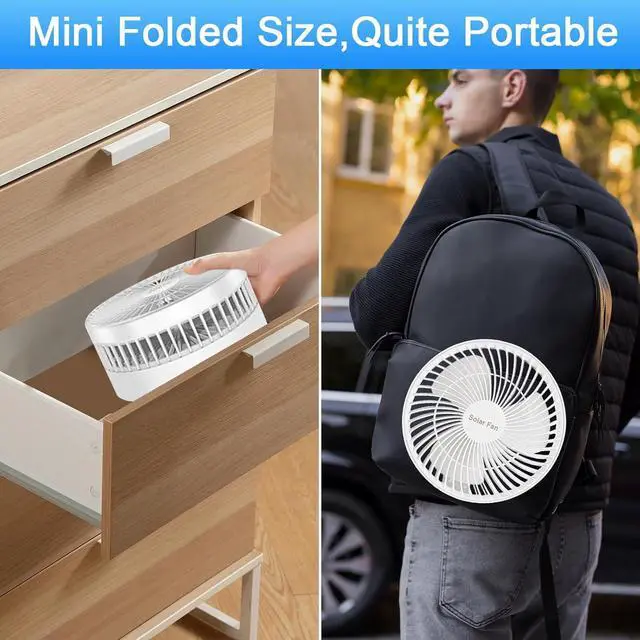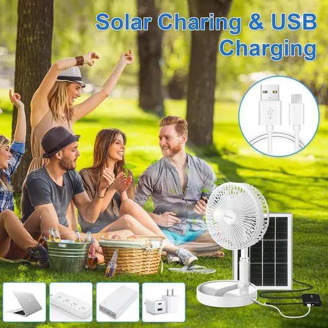 Battery & Solar Powered FanThis portable fan for travel can be charged using either a solar panel or a USB cable. It utilizes solar energy for charging whenever there is sunlight, while a USB cable provides a quick and convenient alternative. Equipped with a 5200mAh rechargeable battery, a full charge of approximately 4.5 hours supports 4-10 hours of operating time, depending on different speeds.