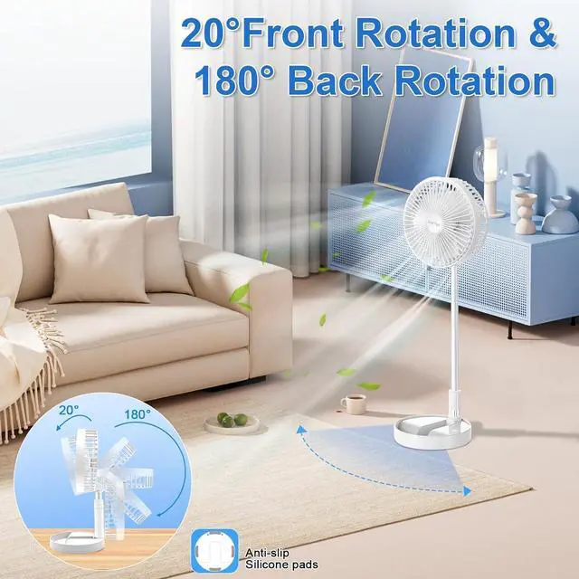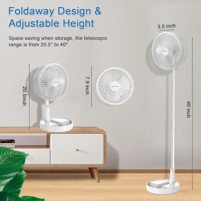 Foldable & Telescopic FanBoasting a unique folding telescopic design, this pedestal fan offers a compact 8" diameter. With an adjustable height, it measures a mere 3.5" when folded and extends to 40" when fully stretched, easily meeting your various height needs. Its small and portable design ensures convenient storage whether in your backpack or drawer, this portable standing fan is always ready for use.