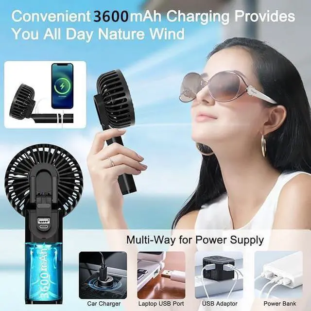 Long-lasting Battery LifeSpeaking of battery life. Our handheld mini fan is powered by a 3600 mAh battery, you can enjoy hours of cooling comfort on a single charge, making it reliable for extended use throughout the day. The rechargeable feature ensures convenience, just plug this fan into your power bank, laptop, or whatever USB port you can find, and voilà instant cooling bliss at your fingertips.