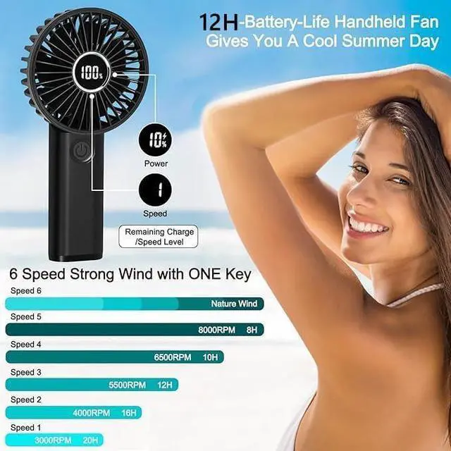 Powerful Airflow with 6 SpeedThis portable handheld fan delivers a surprisingly powerful airflow, thanks to its highly effective motor and 7 sturdy fan blades,despite its small size, it produces a strong and steady stream of cool air that will have you sighing in relief on the hottest of days. The six-speed wind settings provide a customizable cooling experience with the flexibility to adjust to your cooling needs, whether you're indoors or outdoors, whether you need a gentle breeze or a powerful gust of wind.