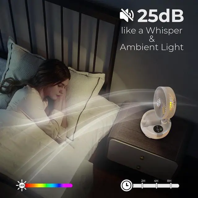 Remote Control & Ambient Light: Enhance your room's vibe with the cozy colorful lights on your battery powered floor fan. Utilize the handy wireless remote (16.4ft control range) to control all. Craft your own inviting and snug space! You can also set the timer for 1, 2, 4, or 8 hours, so you won't have to stress about wasting electricity even if you forget switch it off sometimes